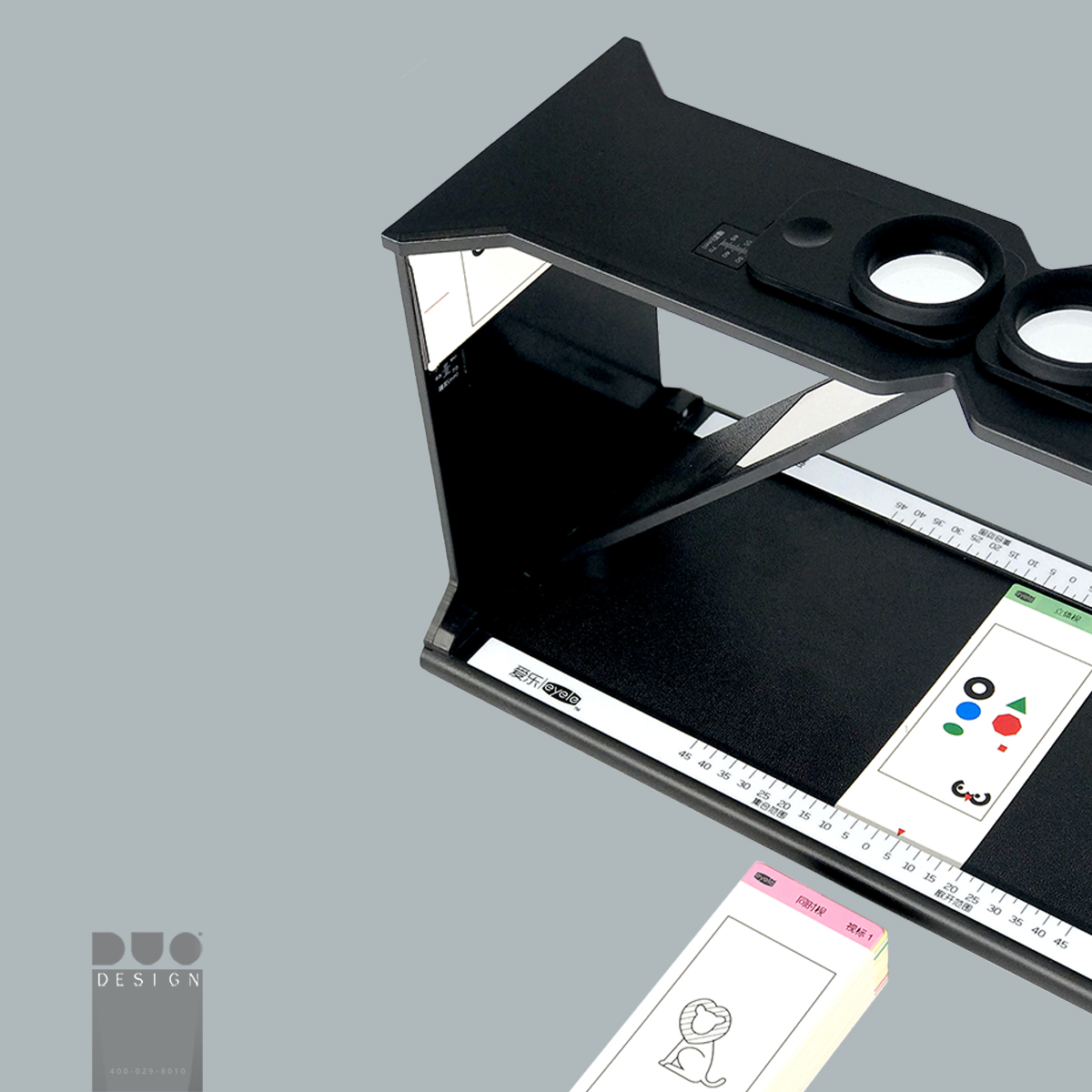 视觉训练仪 2017为爱乐医疗 设计视觉训练仪 本产品利用斜板将左右眼的视野分隔,一只眼通过斜板上的反射镜,将侧板上的画片,经大脑中枢反映到另一眼,该眼又将接收到的画片影像投射到底板上,通过描绘和捕捉训练来消除抑制,建立同时视。然后再进行融像的训练,扩大融像范围,建立立体视觉。 【医疗器械注册证编号】陕械注准20202160175