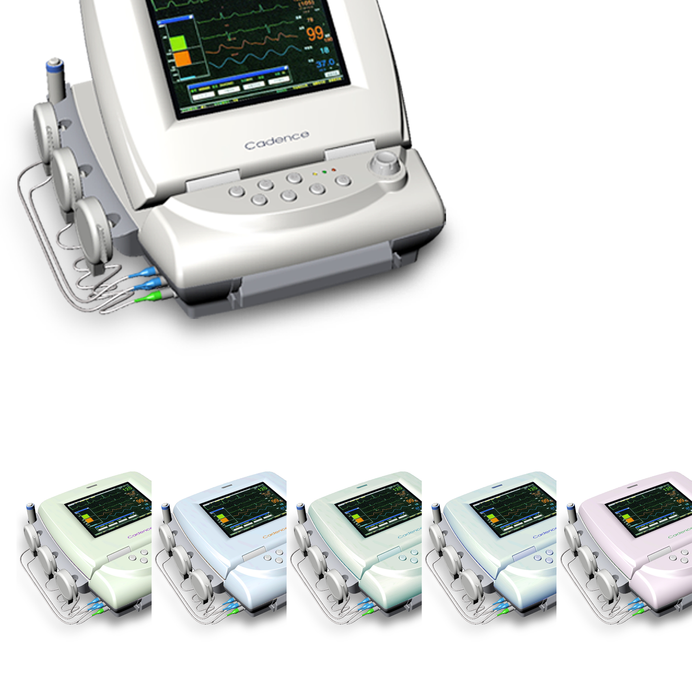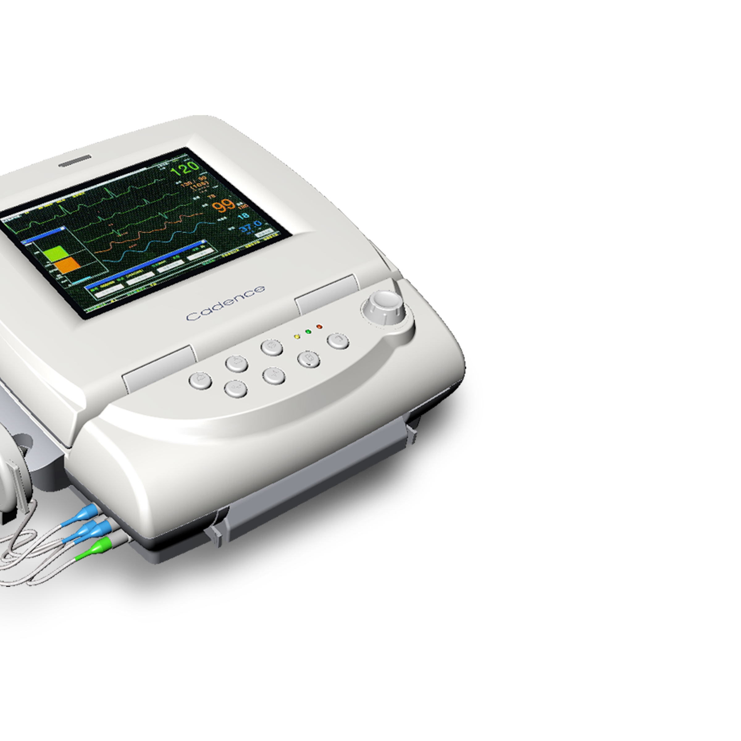 为Cadence 设计监护仪 胎儿监护仪是对胎心率(FHR)提供连续的监护、显示和记录,并且对产前子宫机能(UA)测试和监护。本器械只能由经过培训的医护人员在医院、临床、诊室和病人家中使用。 监护的数据可按操作人员的要求连续或间断的记录在带状图表记录器上。记录的信息包括图表趋势数据和监护仪的软硬件状况信息,时间和日期,病人编号,操作设置的改变,病人和临床医生事件标记。
