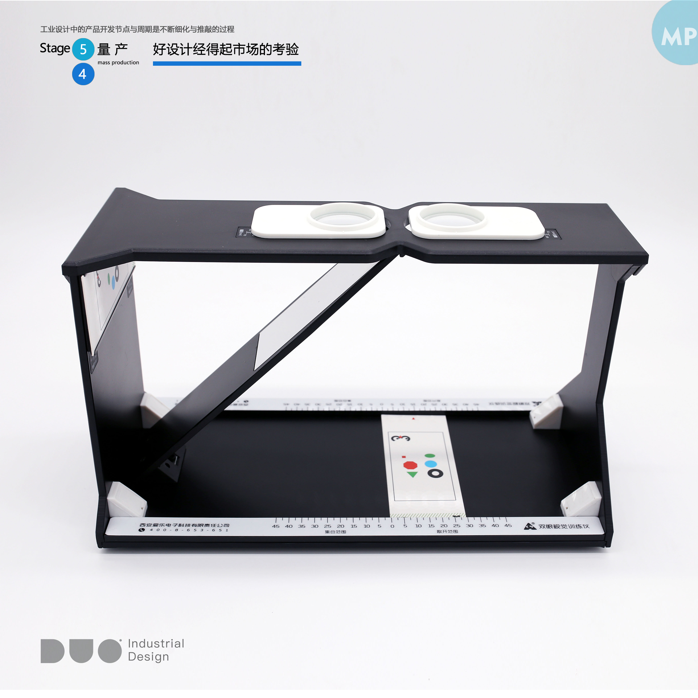 2017为爱乐医疗 设计视觉训练仪 本产品利用斜板将左右眼的视野分隔,一只眼通过斜板上的反射镜,将侧板上的画片,经大脑中枢反映到另一眼,该眼又将接收到的画片影像投射到底板上,通过描绘和捕捉训练来消除抑制,建立同时视。然后再进行融像的训练,扩大融像范围,建立立体视觉。 【医疗器械注册证编号】陕械注准20202160175